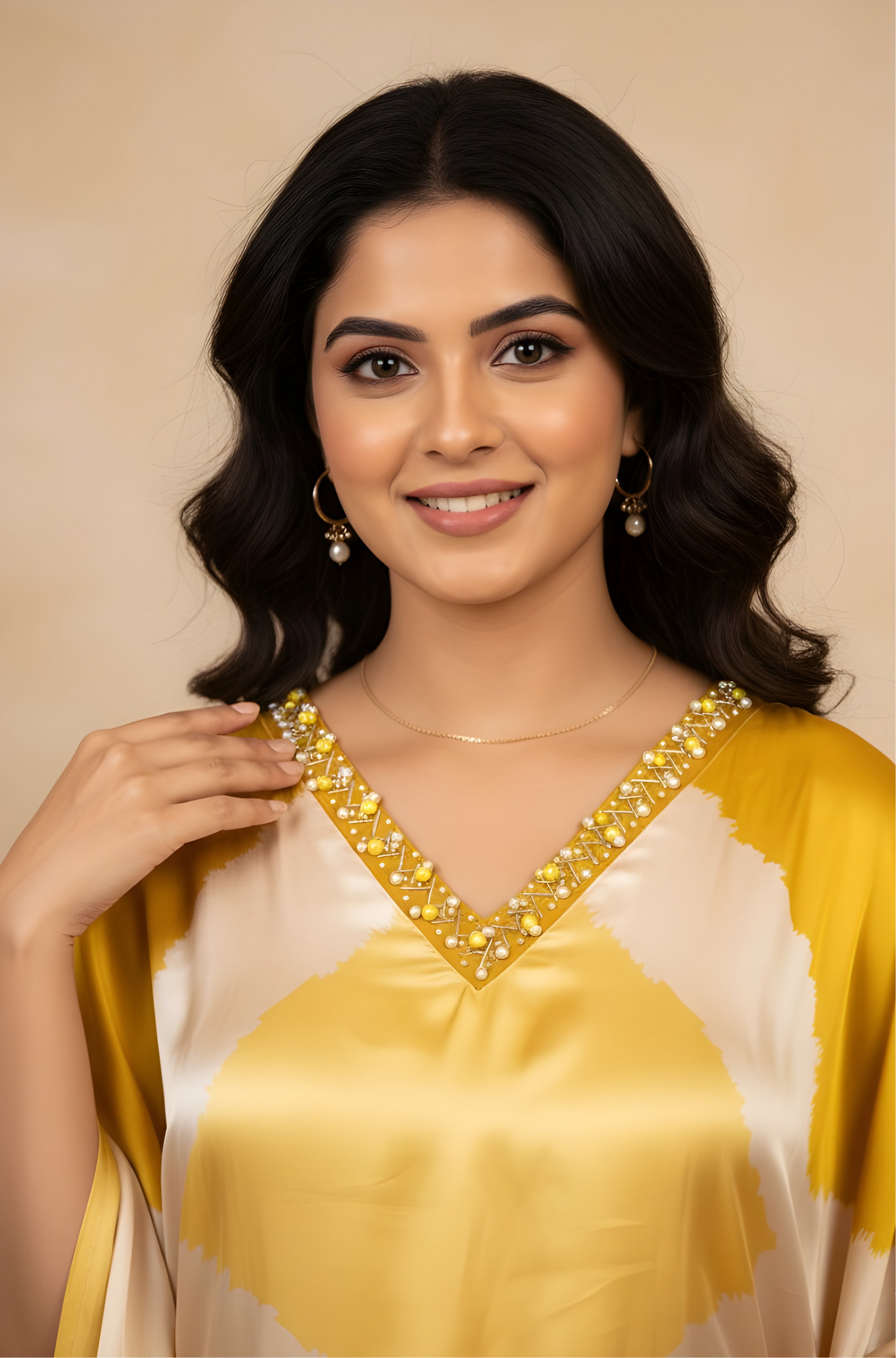 Embellishment: The V−neckline of the Kaftan is intricately embroidered with small pearls and seed beads in complementary yellow and white tones, adding a delicate touch of sparkle and structure.