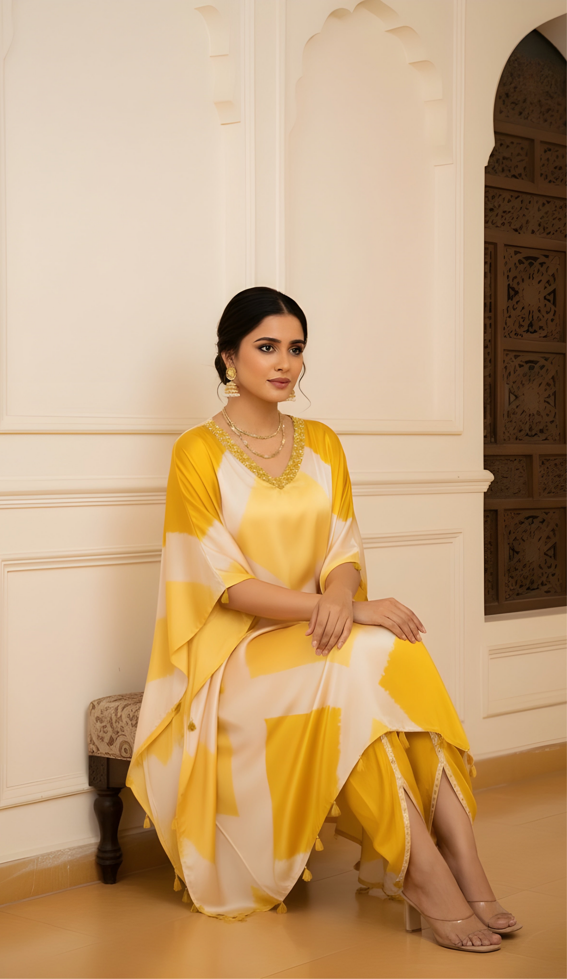 Details: The hemline of the Kaftan is accented with playful matching thread tassels, enhancing the bohemian-chic flow of the garment.